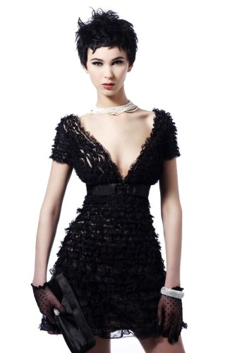 A plunging neckline and A-line skirt featured in this cocktail dress by Sherri Hill 2322 creates the illusion of an ultra-tiny waist. The top of this dress has short sleeves, and a belt defines the high waist. The textured material of this little black dress is light and delicate as it falls to mid-thigh.
